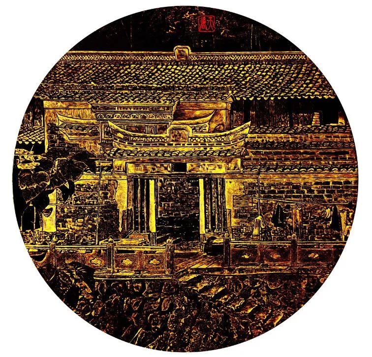 漆艺作品《海丝千年·宁波风光》是毛伟峰与谢比丽、姜子越一起精心创作的联屏组画。作品以河姆渡遗址、天一阁及藏书、刻书等宁波特色风光历史文化名人的形象及故事背景作为创作主体,通过穿插分布的构图形式,绘制体现宁波在海上丝绸之路中的文化交流的重要位置。作品通过对城市建筑局部的精湛刻画,将宁波韵味和魅力展现得淋漓尽致。画面的表现技法主要采用宁波特色的传统非遗漆工艺与现代的绘画语言结合,如彰髹漆艺、漆塑漆绘、非遗戗金戗银等漆艺技法综合使用,综合表现宁波海上丝绸之路的成就。