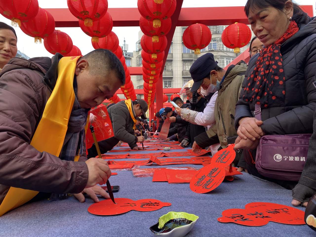 春联福字是过年的重头戏,为满足市民贴春联的民俗需求,新碶街道联合各社区组织安排了20多场送春联、送福字活动。在星阳菜场和艺碶文化空间,新碶街道书法美术协会的成员们凝神聚气、挥毫泼墨,将新年的美好祝福付诸笔端,一副副赋有吉祥寓意的春联、一张张饱含神韵的“福”字很快跃然纸上。