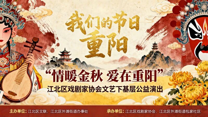 “情暖金秋 爱在重阳”江北区戏剧家协会文艺下基层公益演出,由江北区文联、江北区外滩街道办事处共同主办,江北区戏剧家协会、江北区外滩街道包家社区联会承办。本次活动是宁波市“我们的节日·重阳”主题系列活动之一,也是江北剧协重阳佳节的一项“社会实践”活动,更是江北剧协“文艺赋美”系列活动之一。