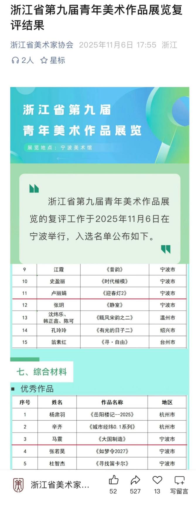 • 喜讯|马震、卢丽娟入选浙江省第九届青年美术作品展2025/11/10