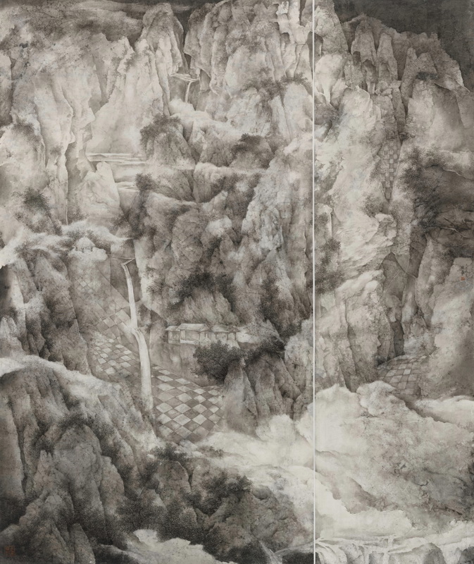 在此次入选的作品中,陈赛赛还是一如既往地以“云壑”为载体,延续了中国山水画“观物取象,澄怀味象”的传统创作逻辑,通过对巍峨山谷、云雾烟岚的描绘,传递传统山水“天人合一”的哲学意境,让观者在自然山水的壮阔中,获得精神的宁静与超脱,这也是她对传统山水文化内核的坚守。在《云壑新晖》的创作过程中,陈赛赛将“今晖”作为突破口,将现代艺术的“光影意识”“构成意识”注入创作,通过水墨光影模拟“晖”的明暗变化,用几何化棋盘格构建现代视觉构成,打破了传统山水的“古意”叙事。