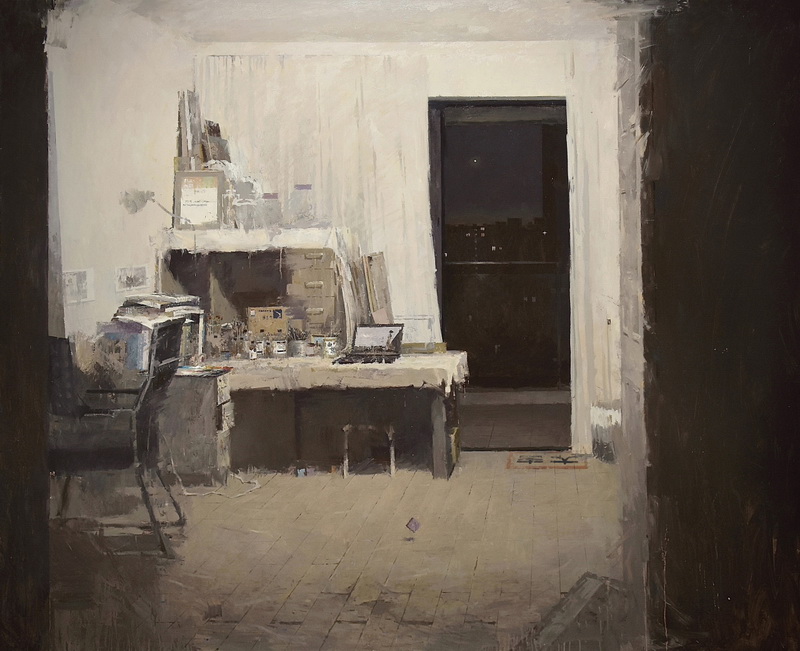 《二十三点的画室二》是赵佰仁画室系列的第二件作品,主要是用时间观念来传递现实物象带来的某种情绪表达。画面主要以暖色调为主,从门口望向室内再到室外的场景,画面室内中心的三层桌柜的物象是他对于目前生活现状的一些阐述,有表层散落五颜六色的孩子积木,到第二层都是绘画创作材料的积累,再到第三层的酒瓶,而画室中的创作画布和画架,将它隐喻在最左侧,通过一张椅子的方向来传递一种在与不在的联系。而落地窗外的风景,也是当下城市生活的现状,二十三点,有的灯火通明,有的酣然入梦。