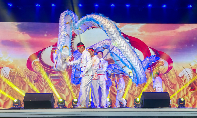 晚上寒意凛冽,但文化礼堂座无虚席,村民们热情高涨。活动在关头村舞龙队气势恢宏的开场舞龙《腾龙起舞庆丰收》中拉开帷幕,白龙翻腾间尽显乡村丰收喜悦与昂扬气象,瞬间点燃现场氛围。随后,男声独唱《咱老百姓》唱出了百姓心声,引发了观众的强烈共鸣。快板《最炫中国风》用明快节奏展现传统曲艺的独特魅力,呼啦圈表演《呼啦圈转转转》则以灵动技巧赢得阵阵喝彩。